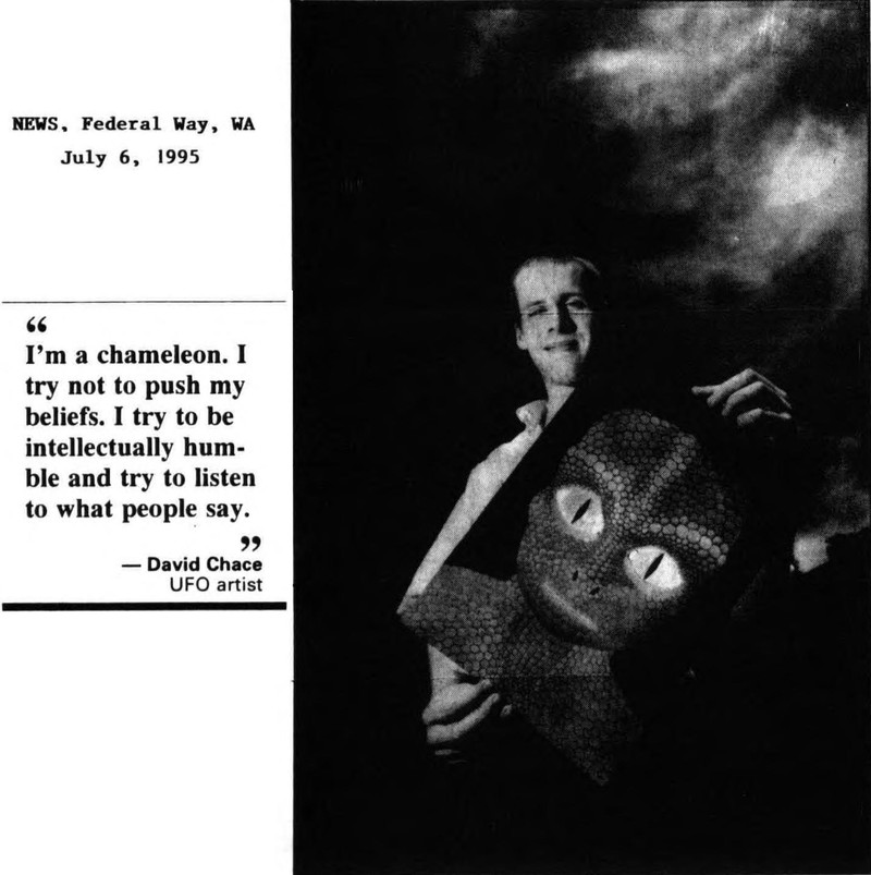 So a guy who paints reptilian aliens calls himself a "chameleon."  It's interesting how people will reveal their true natures when simply allowed to express themselves.  From UFO Newsclipping Service, 1995.