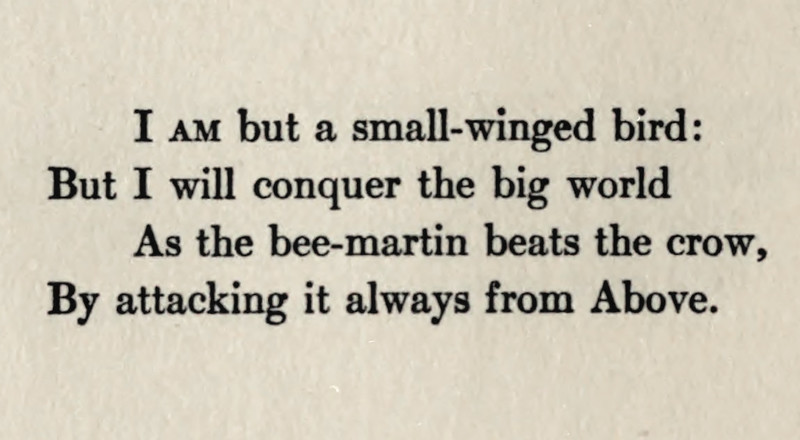 "I am but a small-winged bird: / But I will conquer the big world / As the bee-martin beats the crow, / by attacking it always from Above." From Poem Outlines by Sidney Lanier, 1908.