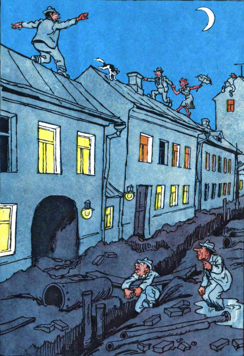 #vintage illustration #rooftop #night walk #road closed