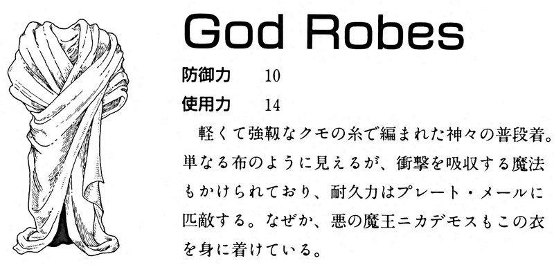 God robes go pretty well with ... all of creation, actually. Not rainproof, though, so you'd literally better be able to walk on water. From the Phantasie handbook.