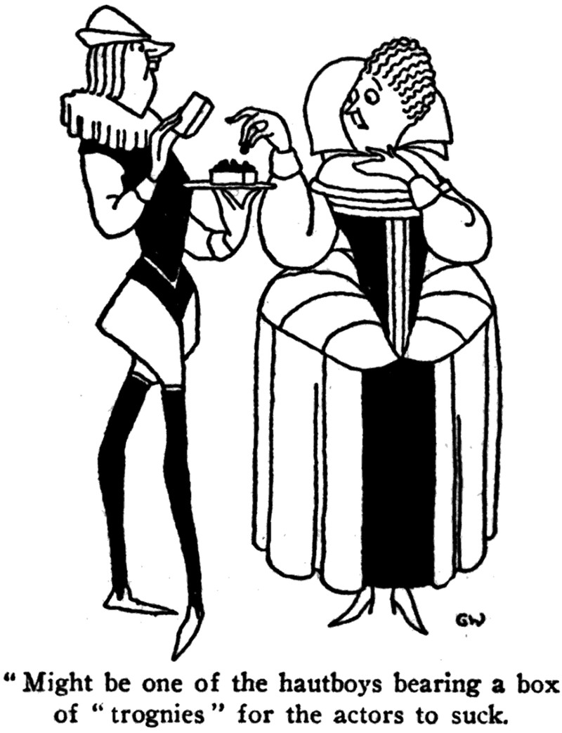 "Might be one of the hautboys bearing a box of 'trognies' for the actors to suck."  From Of All Things! by Robert Benchley, 1921.