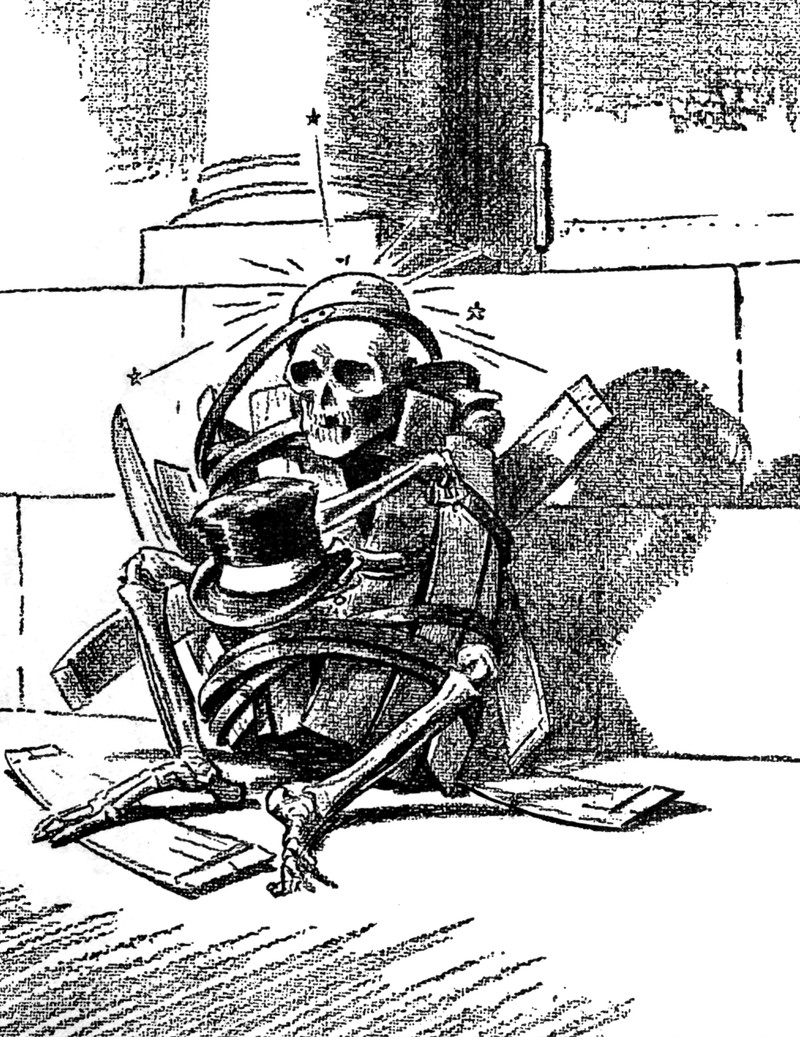Here's a skeleton bursting out of a rum barrel (as they'll do), from Cartoons Magazine, 1920.