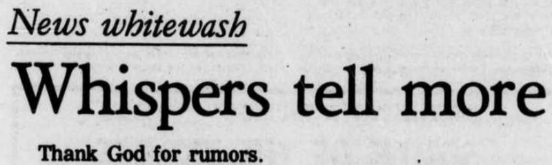 "News whitewash.  Whispers tell more.  Thank God for rumors."  From the Kansas State Collegian, 1975.