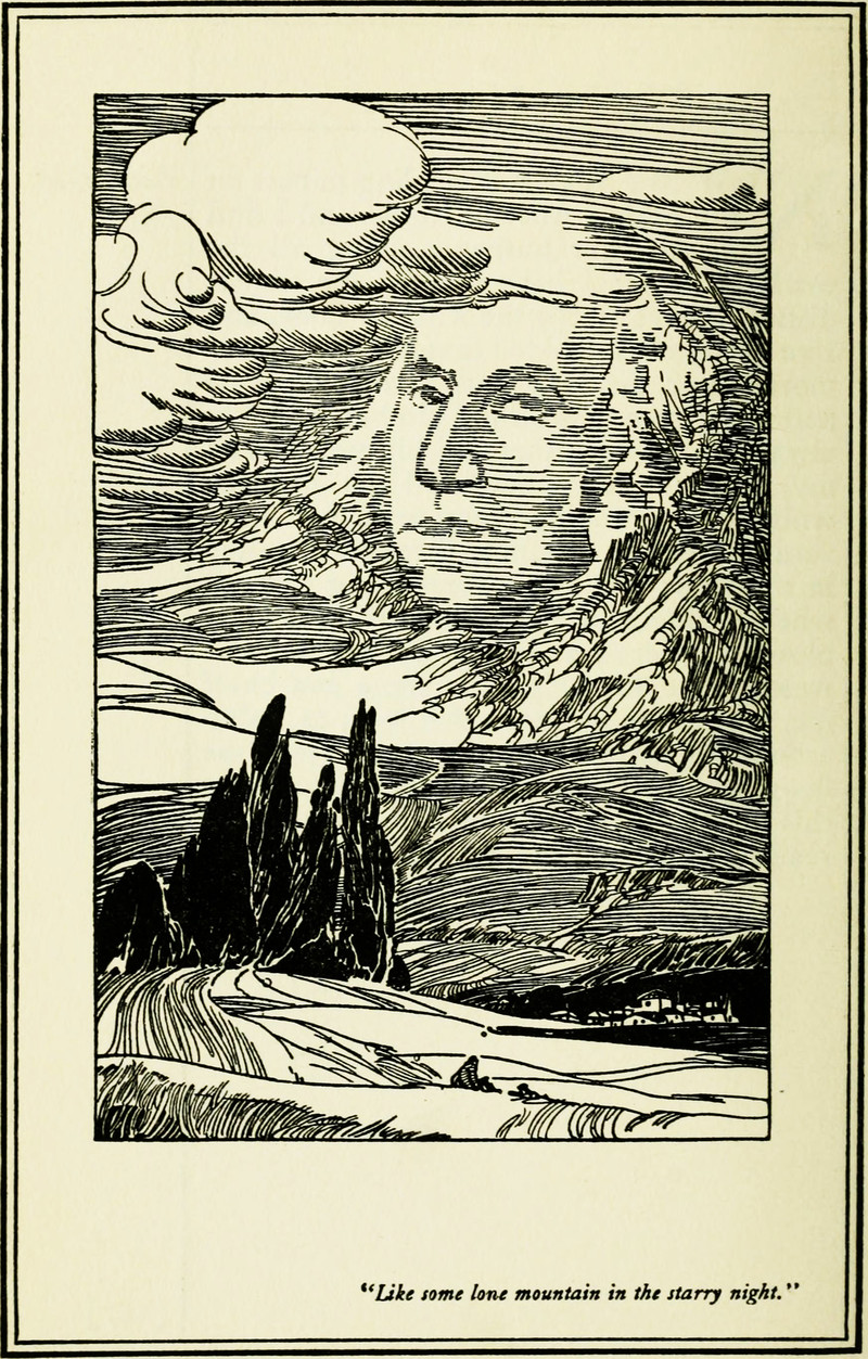 Here's a precursor to Mount Rushmore, from Walt Mason: His Book, 1916.  The caption reads, "Like some lone mountain in the starry night."
