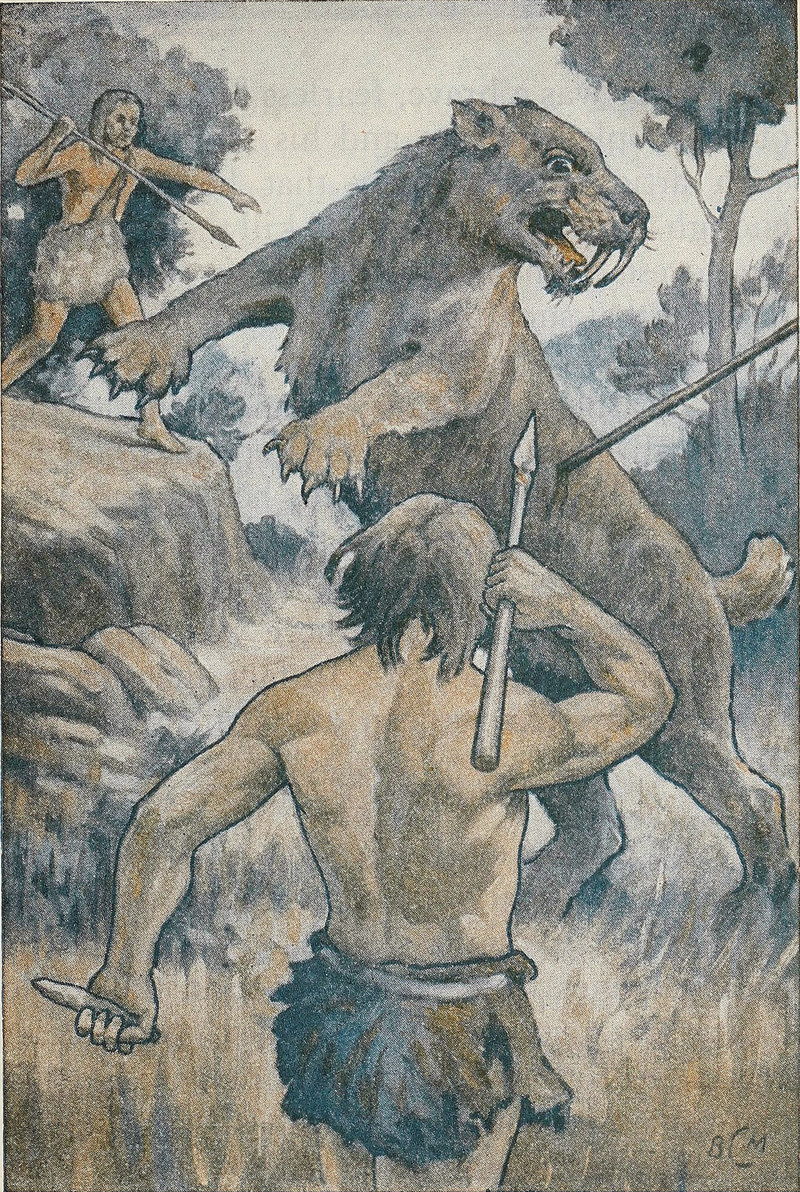 #vintage illustration #animal attack #cave #1930s #caveman #illustration #prehistoric #saber-tooth tiger