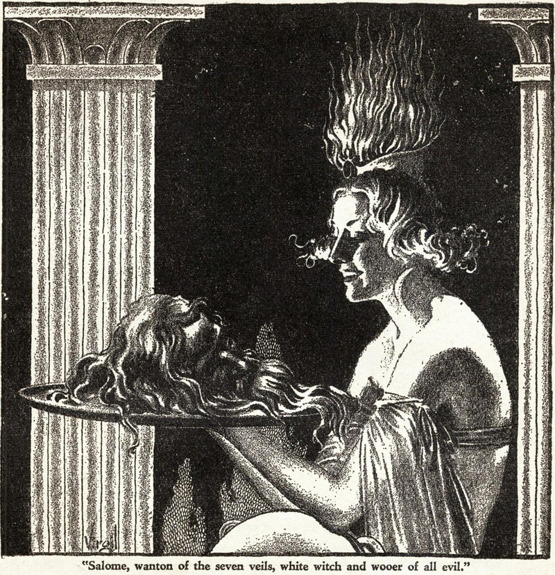 "Salome, wanton of the seven veils, white witch and wooer of all evil."  From Weird Tales, 1939, illustrated by Virgil Finlay.