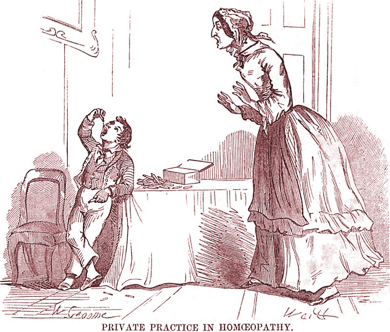 An illustration from an 1854 issue of Arthur's Home magazine.  The caption reads: "Private practice in homeopathy."