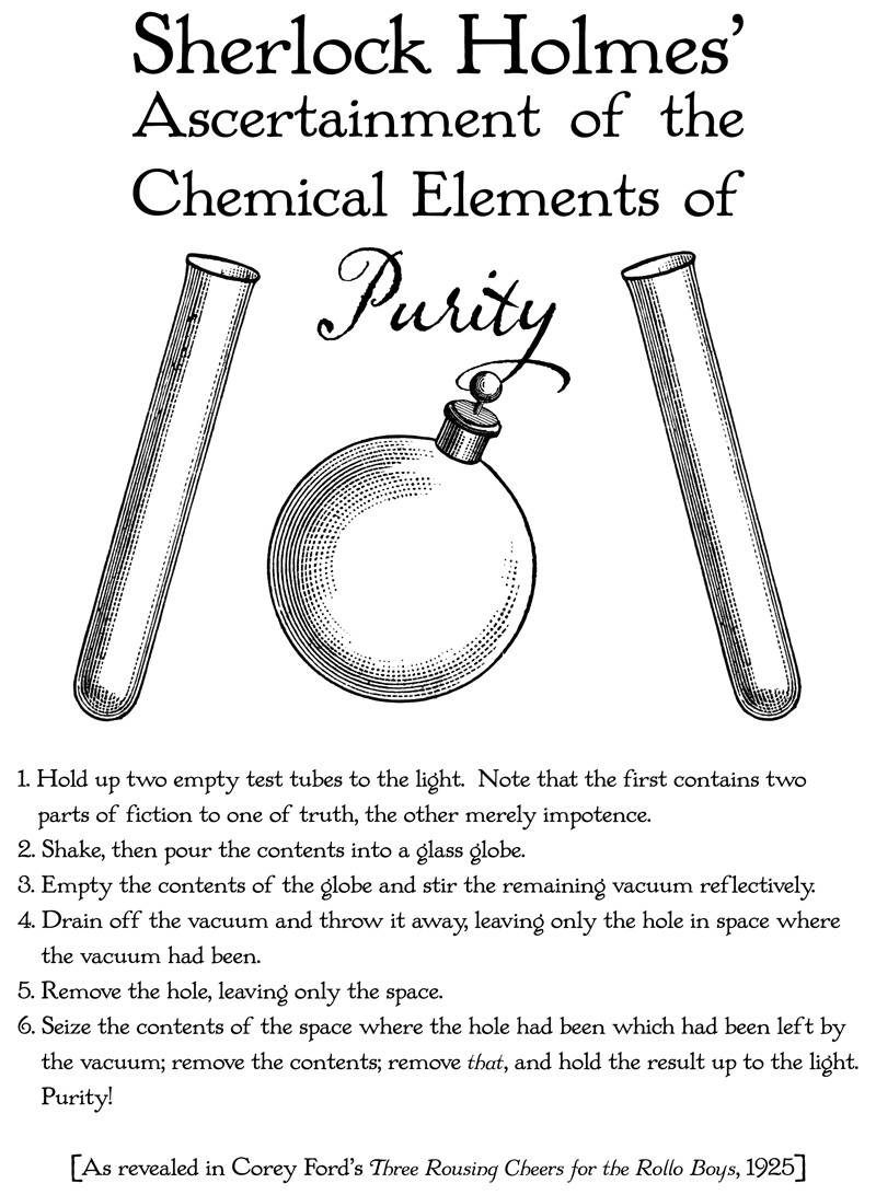 1. Hold up two empty test tubes to the light. Note that the first contains two parts of fiction to one of truth, the other merely impotence.