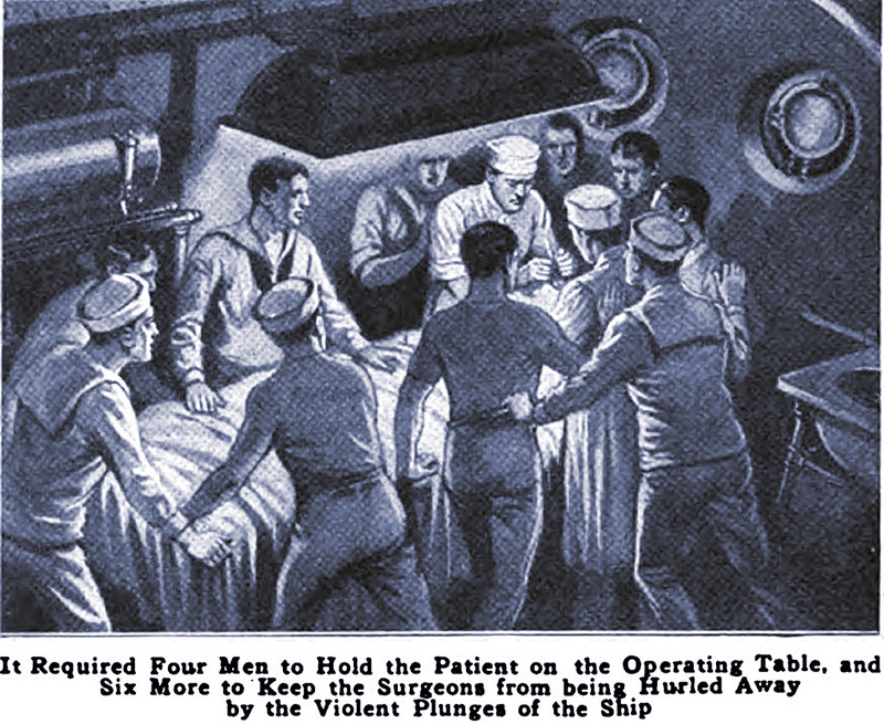 "It required four men to hold the patient to the operating table, and six more to keep the surgeons from being hurled away by the violent plunges of the ship."  From Popular Mechanics, 1919.