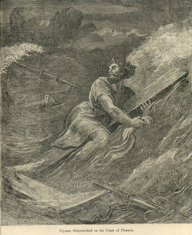 "Ulysses shipwrecked on the coast of Phaeacia." From Chatterbox, 1886.
