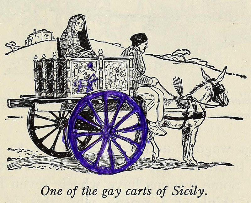 A gay cart of Sicily that has been colored in gaily.  From Travel By Air, Land, and Sea by Hanson Hart Webster, 1933.