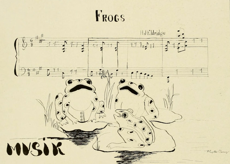 #vintage illustration #frog #vintage yearbook #yearbook #musical animal #1890s #illustration #singing frog #glee club #singing animal