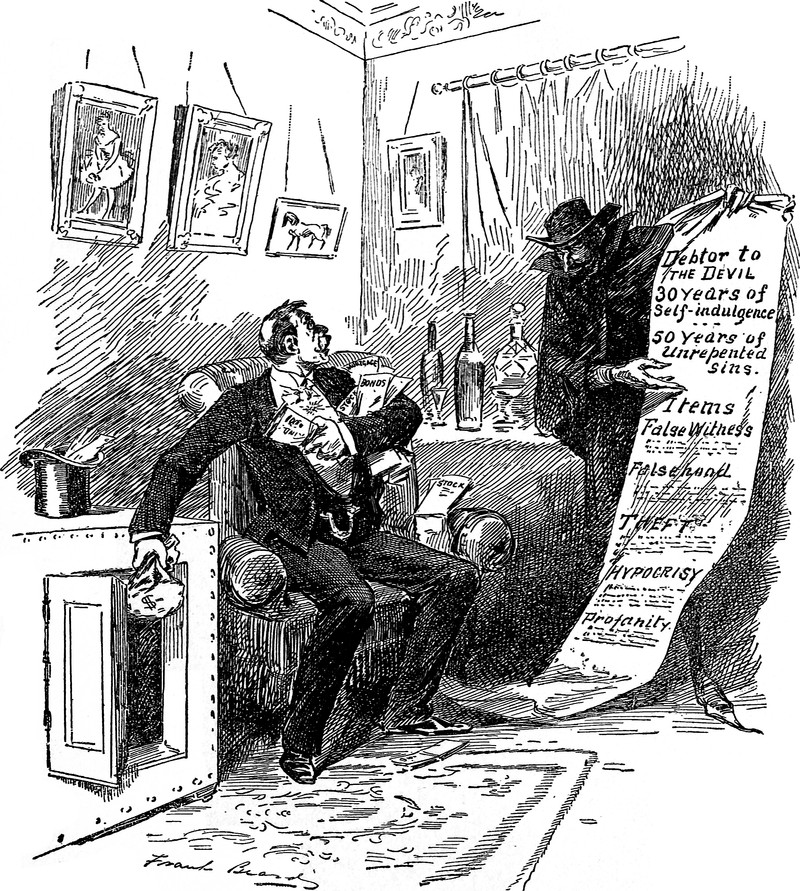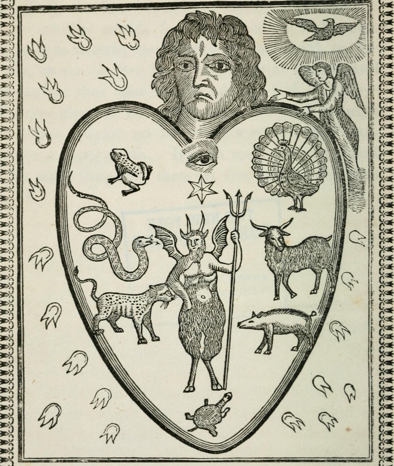 Here the devil reigns over a man's heart full of pride (the peacock), unchastity (the goat), gluttony (the hog), avarice (the toad), envy (the snake), anger (the tiger) and indolence (the tortoise). From The Heart of Man by Johannes Gossner, 1851.