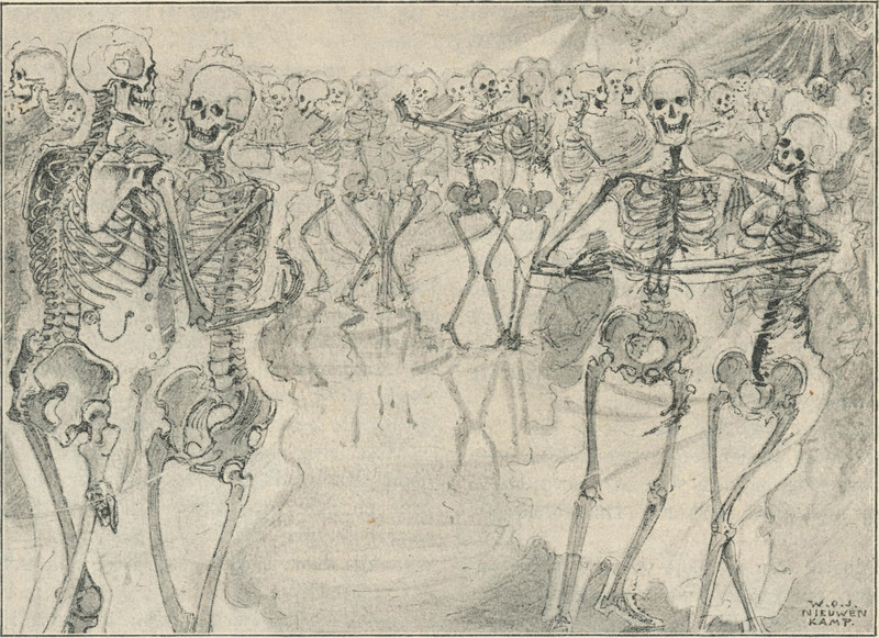 #vintage illustration #macabre #skeletons #living dead #skeleton ball #illustration