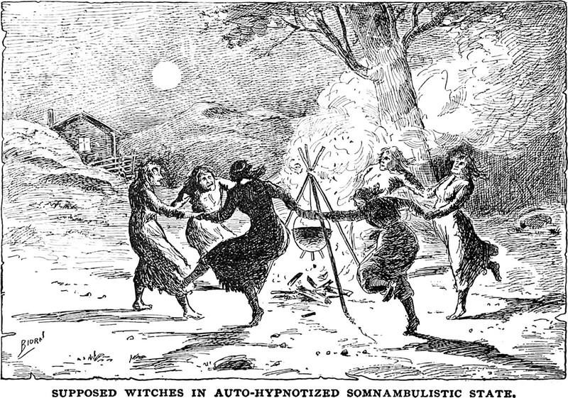 An illustration from Hypnotism: Its Facts, Theories and Related Phenomena by Carl Sextus (1893). The caption reads: "Supposed witches in auto-hypnotized somnambulistic state."