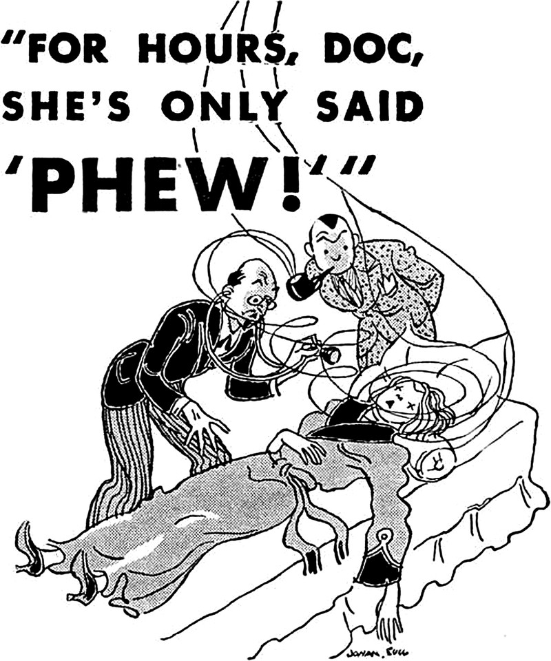 "For hours, Doc, she's only said 'Phew!'"  From Popular Mechanics, 1934.
