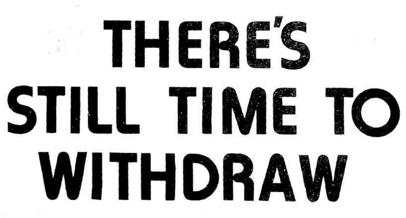 Great news!  "There's still time to withdraw."  From Woroni, 1975.