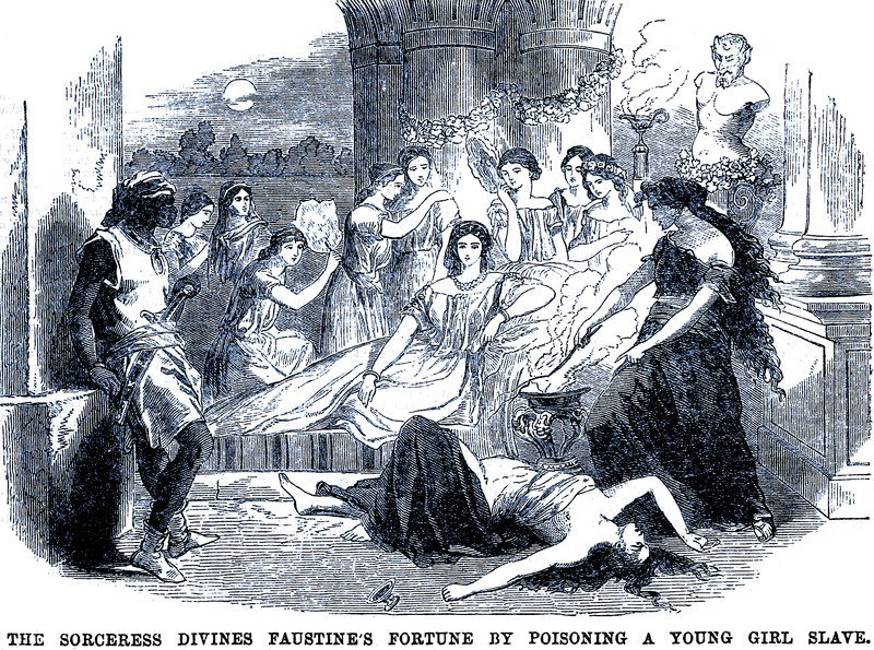 "The sorceress divines Faustine's fortune by poisoning a young slave girl," from Dicks' English Library of Standard Works, 1884.