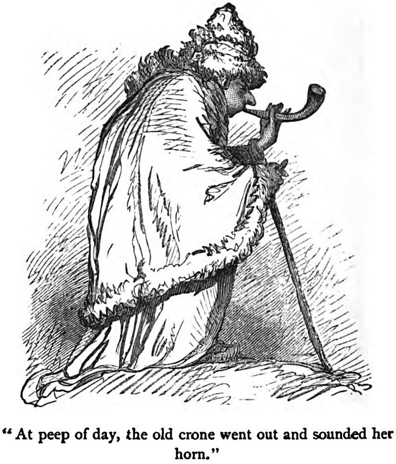 "At peep of day, the old crone went out and sounded her horn."  From Old Norse Fairy Tales Gathered From the Swedish Folk by George Stephens and H. Cavallius, 1882.