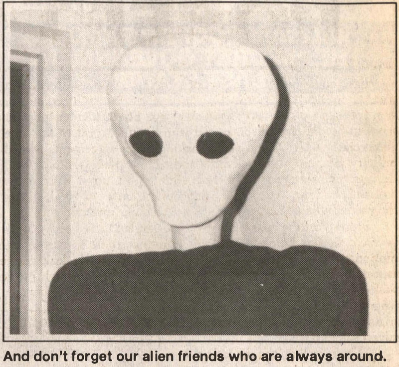 "And don't forget our alien friends who are always around."  From UFO Review, 1992.