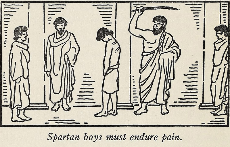 "Spartan boys must endure pain."  From School Boys of Long Ago, Part Two by Beatrice Hurley & Ina Sartorius and illustrated by Henry Rood, 1935.