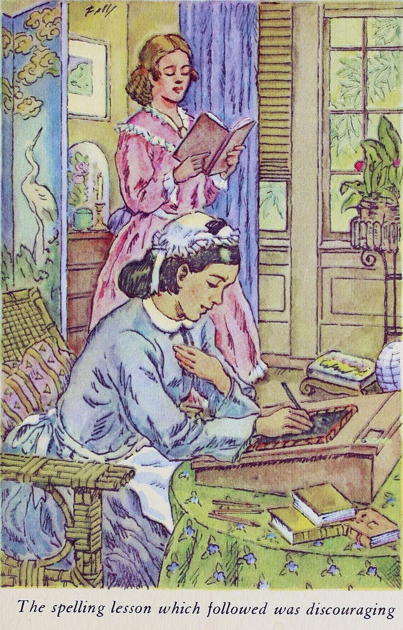 "The spelling lesson which followed was discouraging."  From Eight Cousins by Louisa M. Alcott and illustrated by Mary Lamberton Becker, 1948.