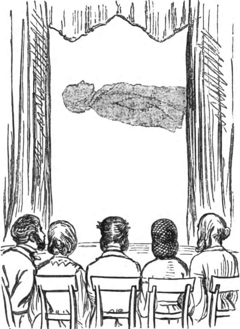 "Casting out the evil spirits," plus the same scene in the ghostly realm (courtesy of the scanning process at Google Books), from The Rappers, Or, The Mysteries, Fallacies, and Absurdities of Spirit-rapping, Table-tipping, and Entrancement by A Searcher After Truth, 1854.