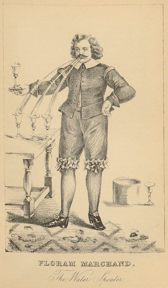 Floram Marchand, The Water-Spouter, depicted in The Book of Wonderful Characters: Memoirs and Anecdotes of Remarkable and Eccentric Persons in all Ages and Countries, Chiefly from the Text of Henry Wilson and James Caulfield, 1869. Image via Bibliodyssey.