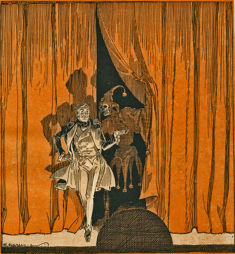 #vintage illustration #death #skeleton #grim reaper #jester #illustration #curtains #stage actor