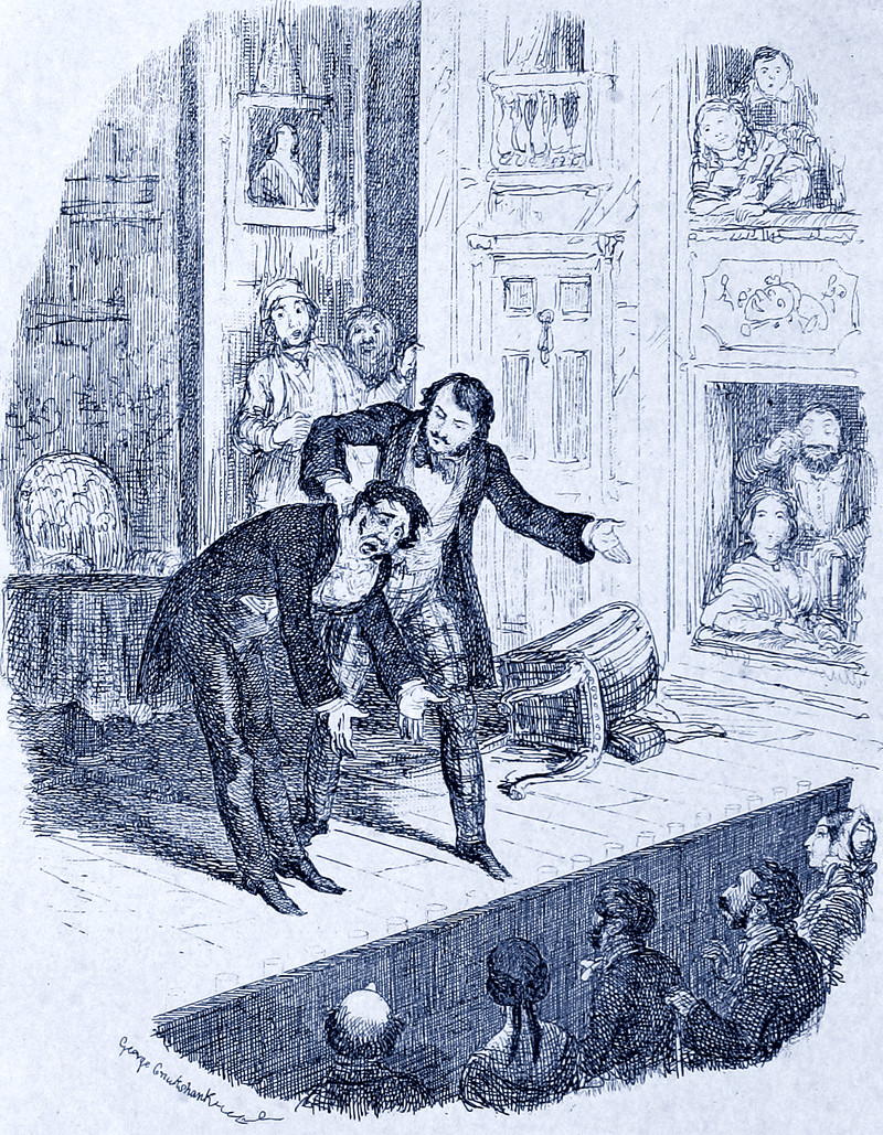 We like how the folks in the box seats resemble figures in wall hangings on the stage. From Lorimer Littlegood Esq. by Alfred Whaley Cole and illustrated by George Cruikshank, 1858.