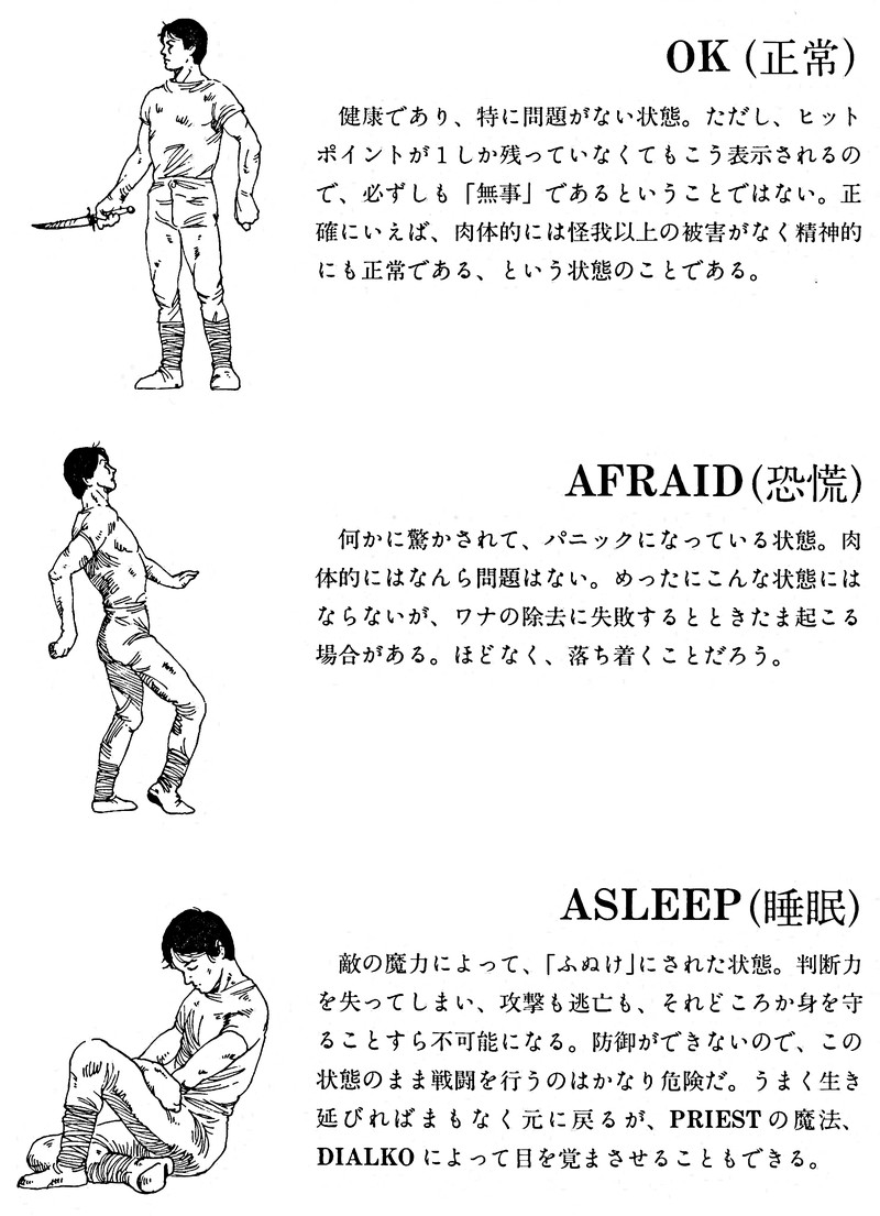 We double-checked, and these are indeed the nine states of existence: 1. OK, 2. afraid, 3. asleep, 4. paralyzed, 5. petrified, 6. poisoned, 7. dead, 8. ashes, 9. lost [as a ghost wandering the otherworld]. From Wizardry Handbook.