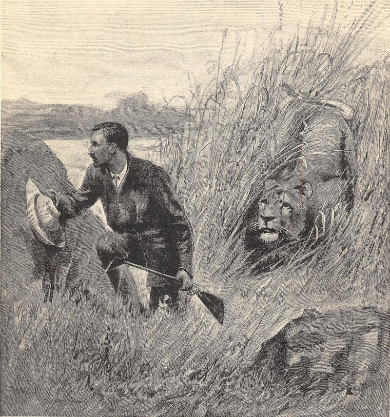 #vintage illustration #lion #hunter #1900s #tables turned #illustration #stalked