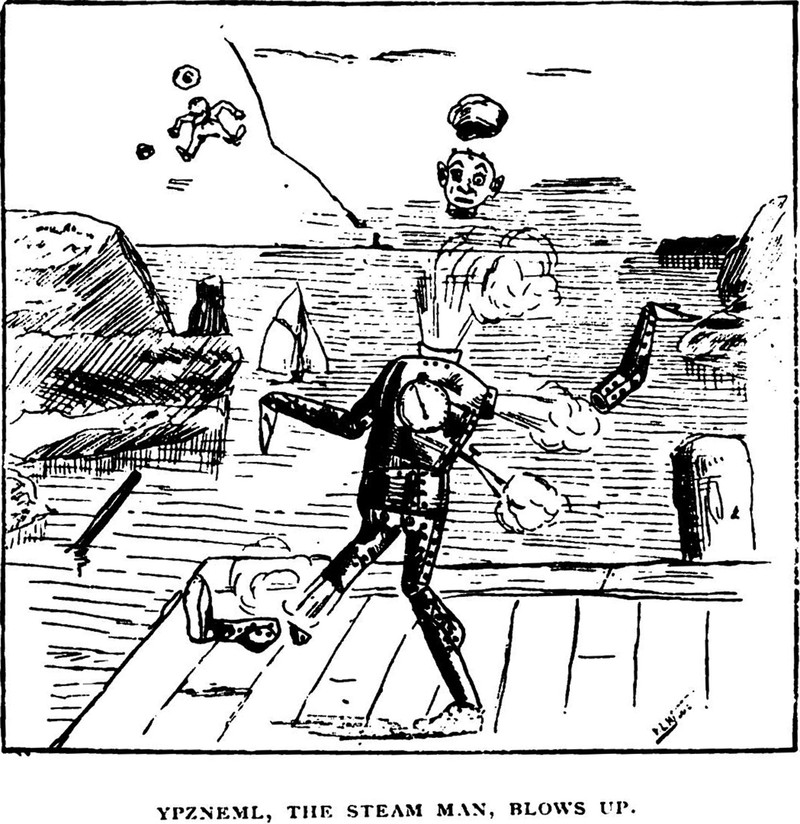 "Ypzneml, the steam man, blows up."  From The Harvard Lampoon, 1887.