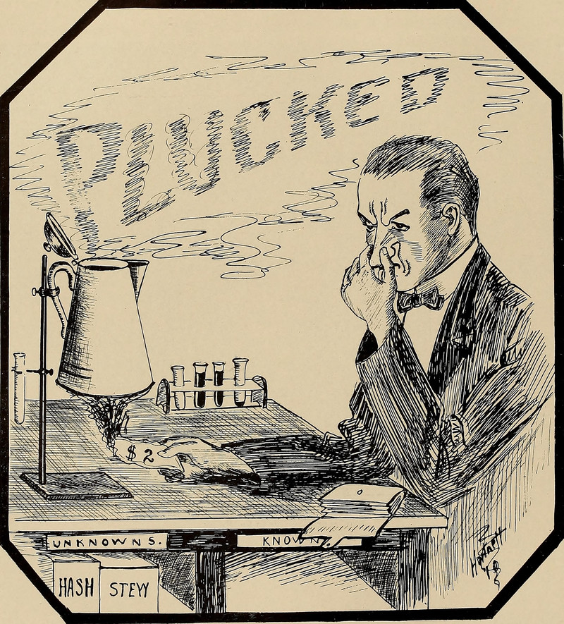 Burning two-dollar bills to heat the unknowns.  From College of the Holy Cross' 1910 yearbook.