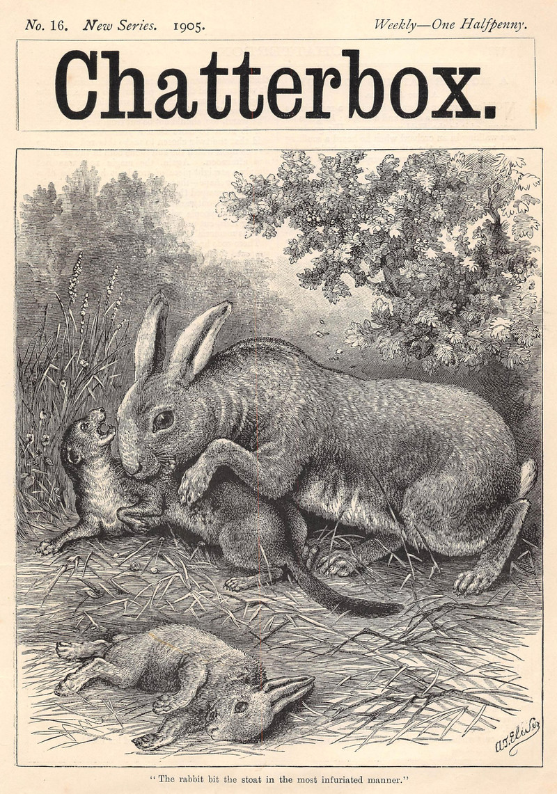Rabbit versus stoat: which would you wager to win?  From Chatterbox, 1905.