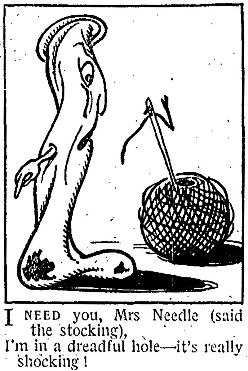 "I need you, Mrs. Needle (said the stocking), I'm in a dreadful hole—it's really shocking!"  From The Children's Newspaper, 1933.