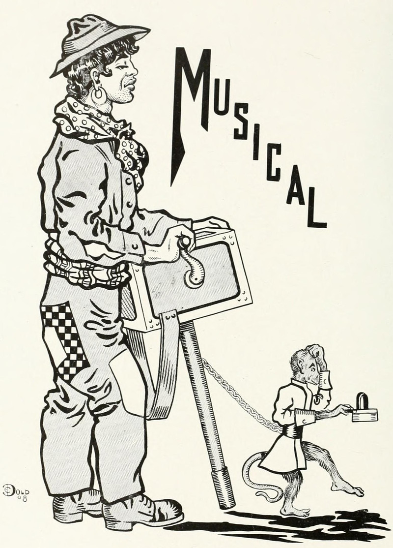 #vintage illustration #vintage yearbook #monkey #yearbook #organ grinder #musician #street musician #street performer