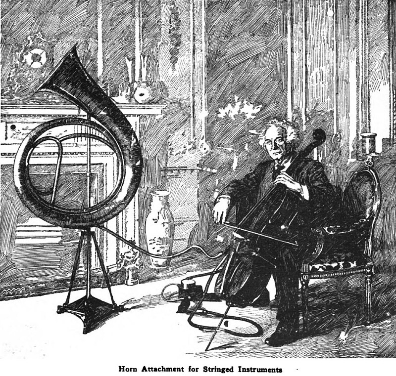 "Horn attachment for stringed instruments."  From Popular Mechanics, 1909.