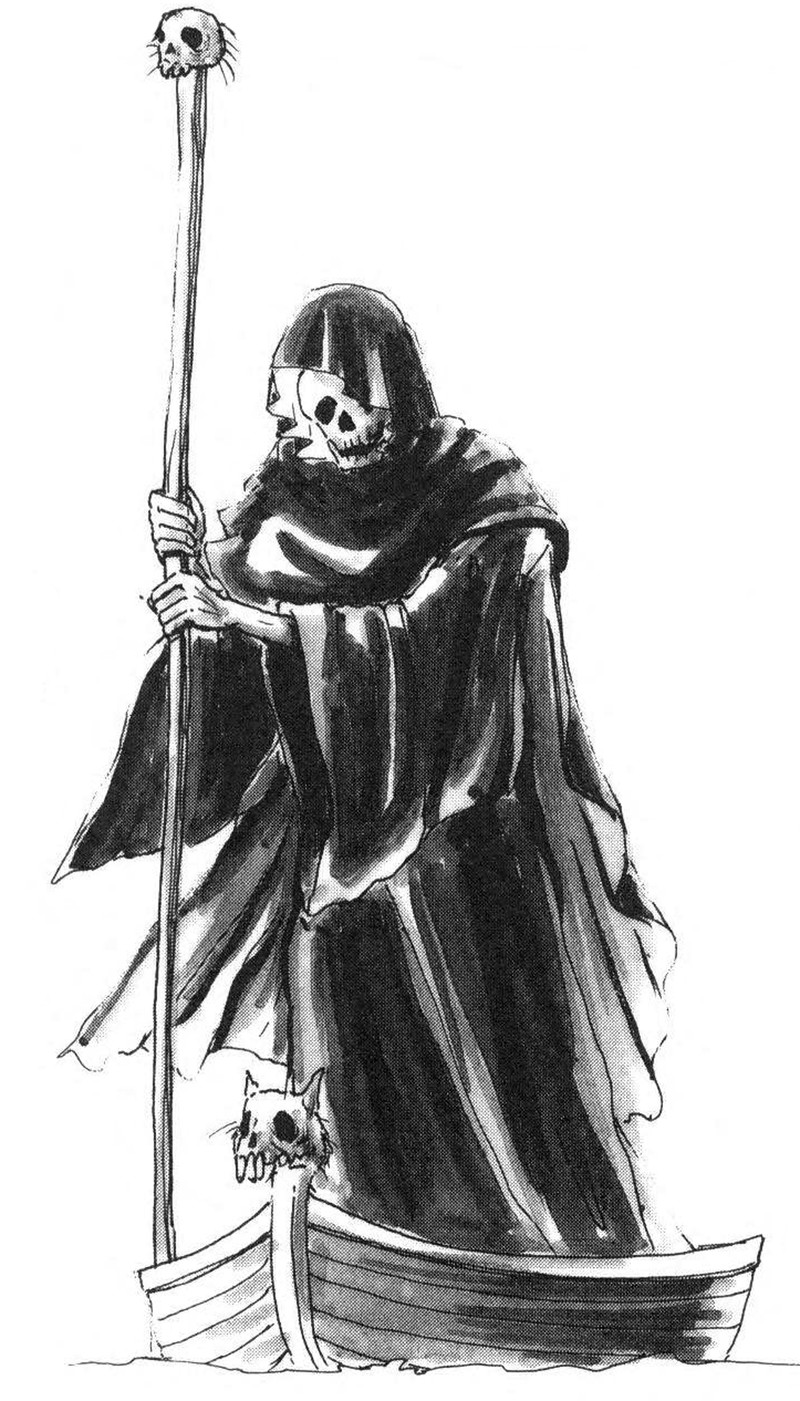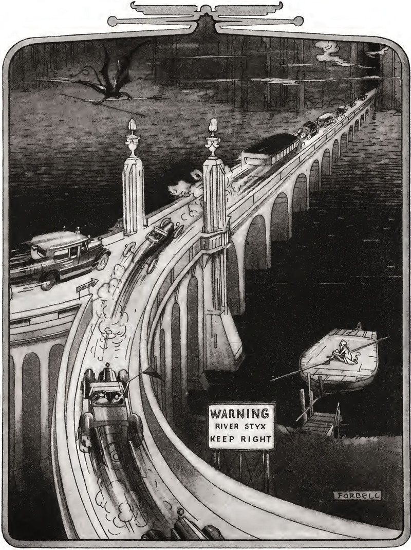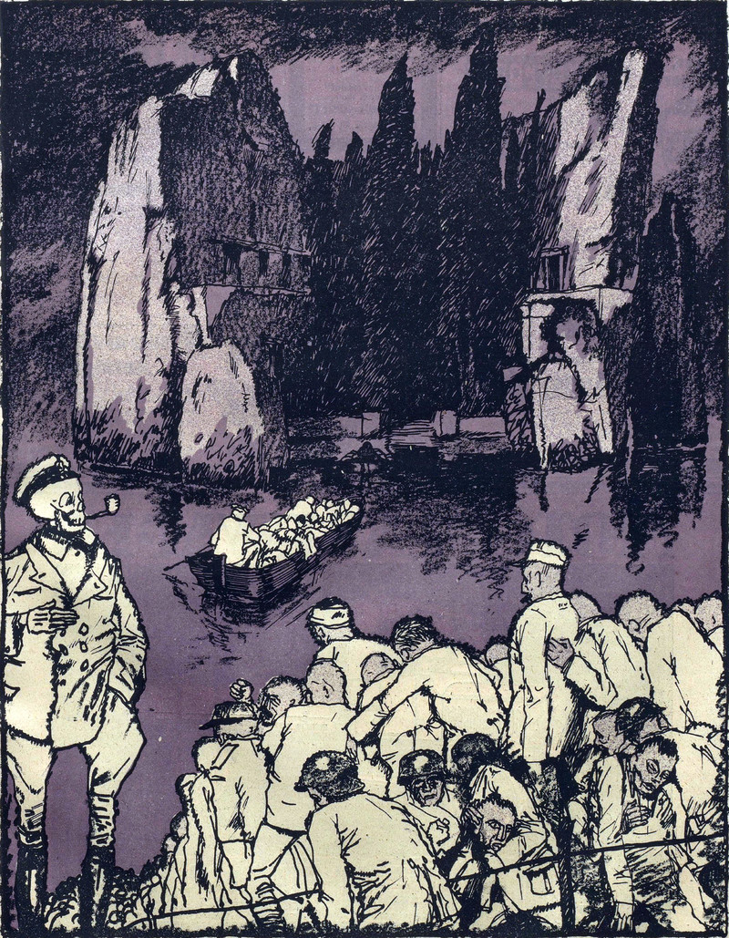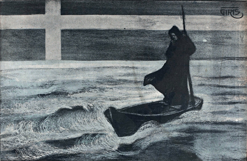 When the boat has eyes, bat wings, and shouded figures aboard, double check your ticket and make sure you're on the right pier. From Lustige Blätter, 1906.