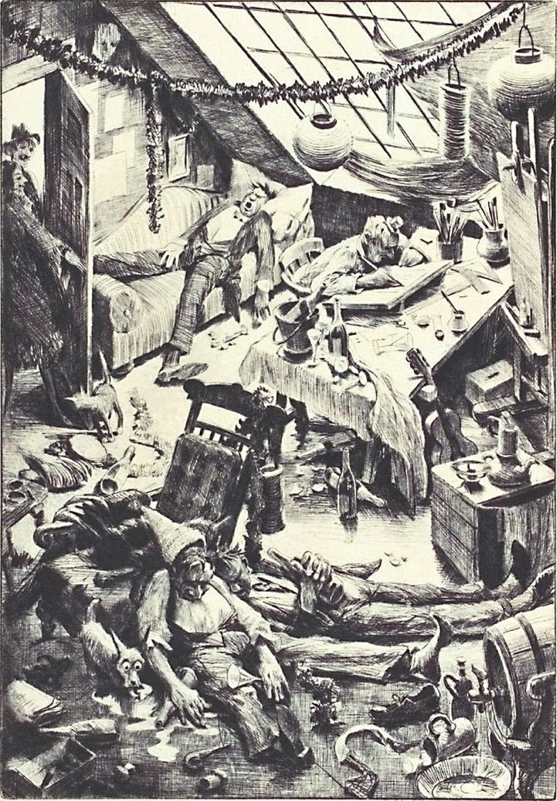 Tag yourself.  Are you the couple innocently coming home to find their loft invaded by four inebriated strangers and two animals?  Are you the person in a tiny hat sketching while your mates are passed out?  Are you the dog surprised by what you just licked?  Are you the only cat who knows what's happening?  Are you the one who dropped a toy airplane before losing consciousness?  Are you the dunce dreaming that tomorrow is a holiday?  Are you the mask on the wall overlooking them all?  From Ulk, 1930.