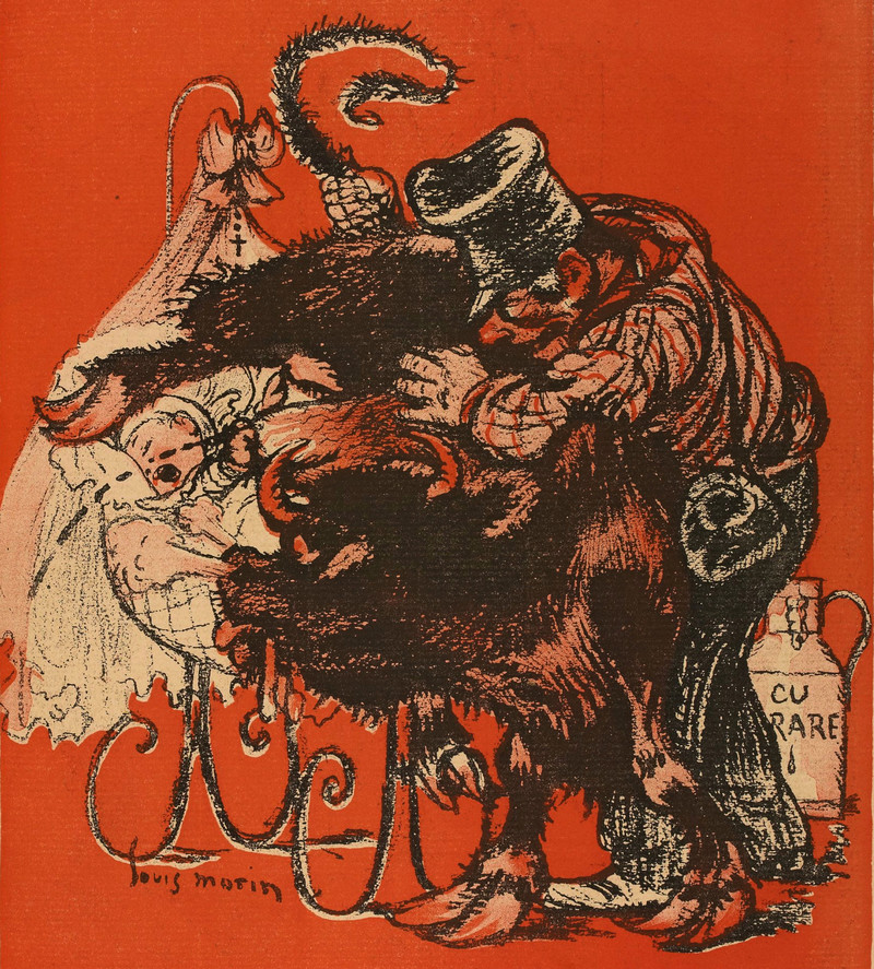 Unregulated milk sprayed at a baby, straight from a tainted cow.  From L'Assiette au Beurre, 1901.