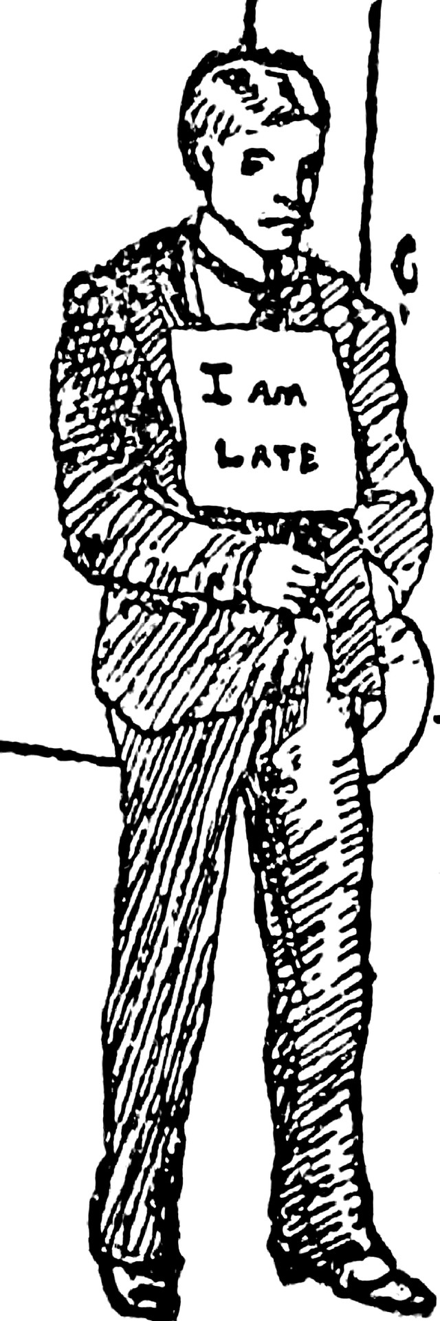 Given that most people we see on the street are dead (as we learned here), it sure would be handy if they chose to identify themselves. Our illustration appears in The Teaching Problem by James Wickleff Axtell, 1902. The sign says, "I am late."