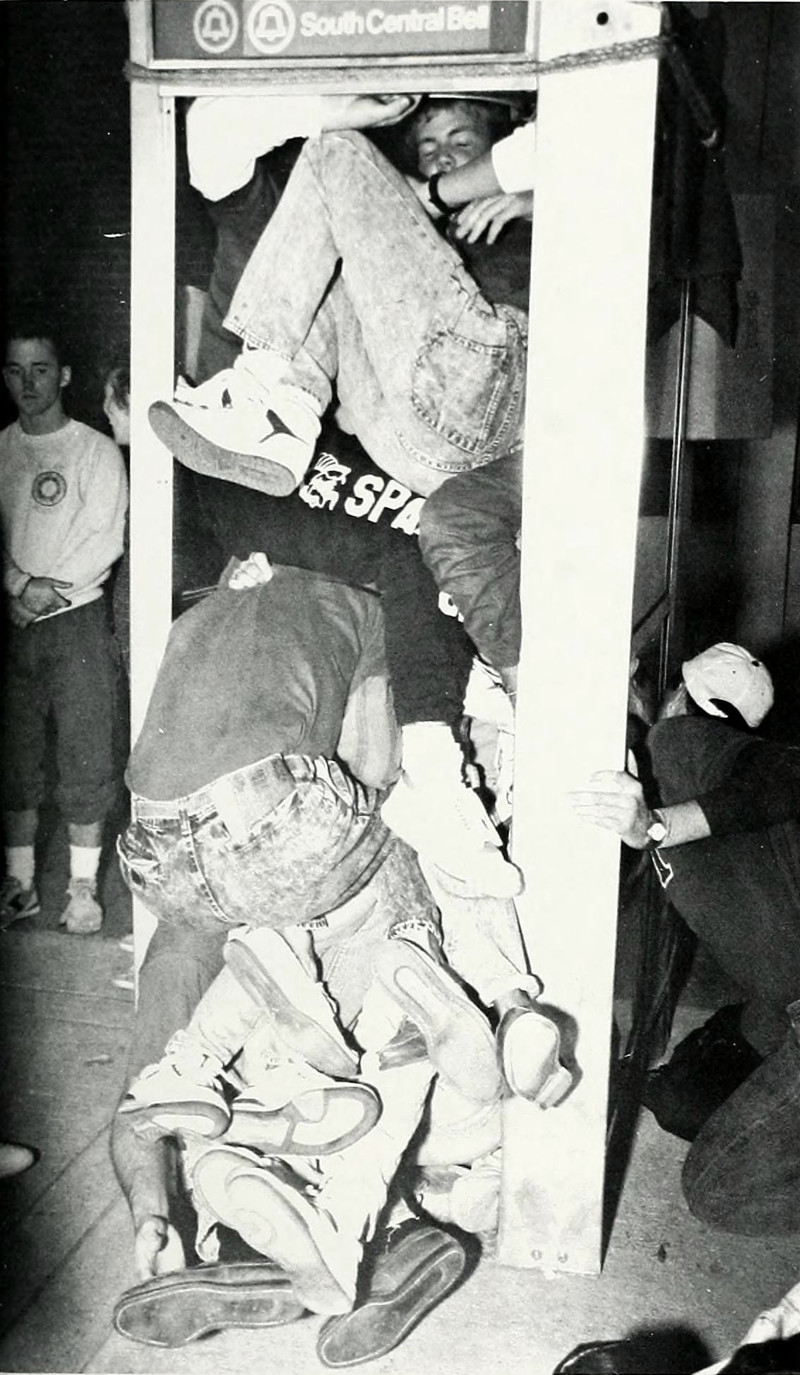 Wikipedia claims that the fad of phonebooth stuffing was passé by the end of 1959, but here it is in 1989.  WTF, Wikipedia?  From Eastern Kentucky's 1989 yearbook.