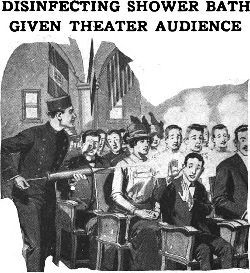 "Disinfecting shower bath given theater audience."  From Popular Mechanics, 1919.