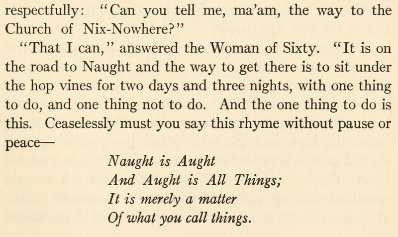 Here's the rhyme that'll get you to the Church of Nix-Nowhere. From The Rainbow String by Algernon Tassin and illustrated by Anna Richards Brewster, 1921.