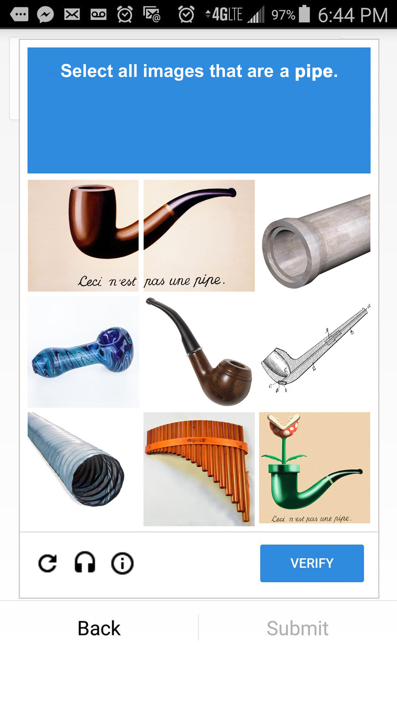 These surreal CAPTCHA puzzles! I can't click "verify" without selecting an image, yet they're all not pipes. It's a Catch-22 (er, CAPTCHA-22?) situation. A robot can't be in a Catch-22, so I've proven I'm not a robot, yet I can't submit my proof.