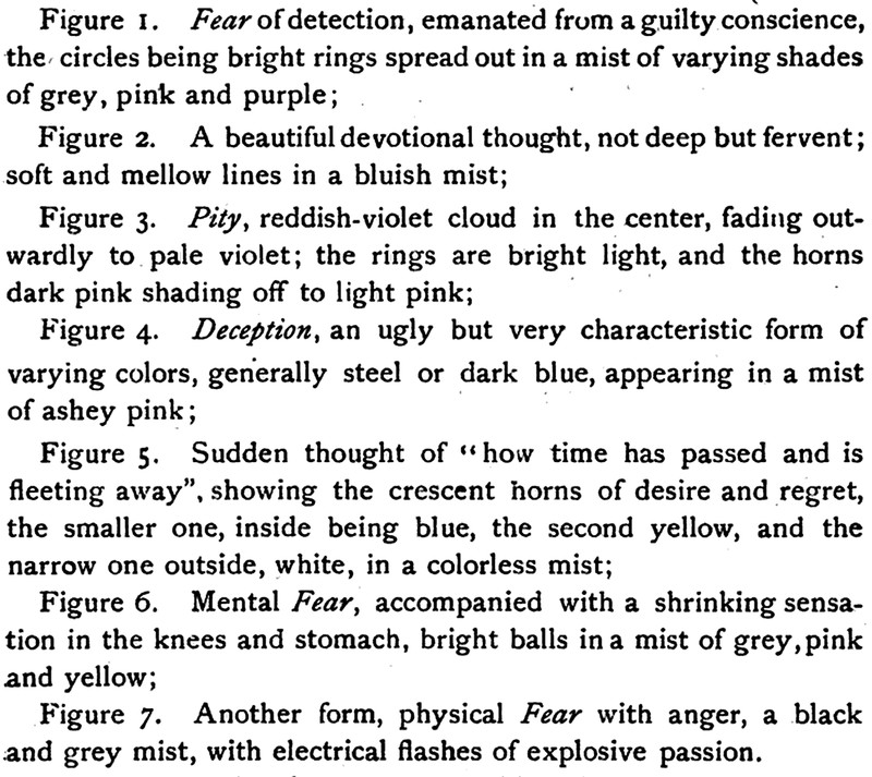The "thought-forms" of fear of detection, devotion, pity, deception, lost time, dread, and anger.  From The Human Aura, A Study by A. Marques, 1896.