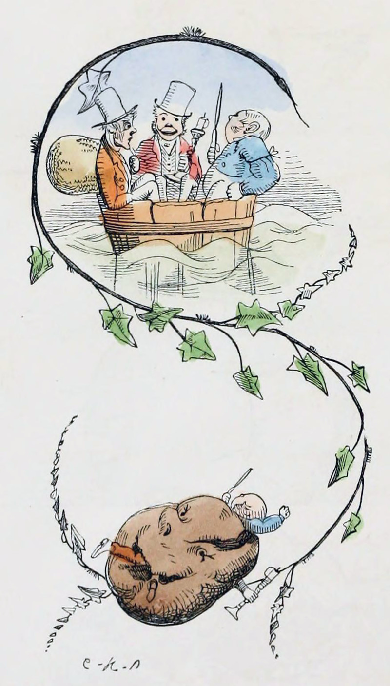 #vintage illustration #potato #illustration #three men in a tub #1850s