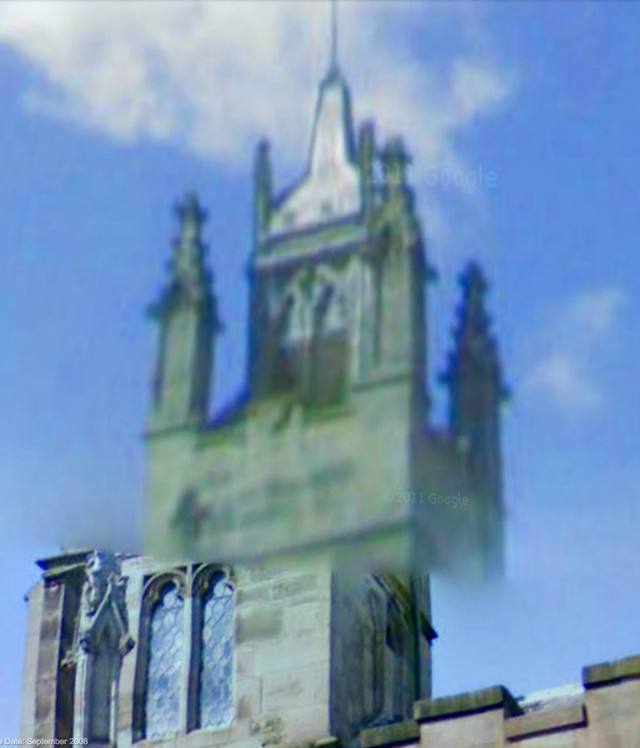 Speaking of castles in the air, we spotted the immaterial tower below within the world of Google Maps.  This castle "exists" in the town of Warwick, England.  But get this: we spent so much quality time bi-locating to England that Google defaulted our browser to the U.K. version.  No kidding: we're automatically redirected to Google.co.uk, even when we explicitly type "google.com."  Can't make this stuff up.