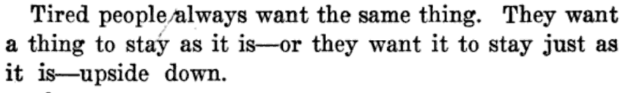 What do tired people want?  "Tired people always want the same thing.  They want a thing to stay as it is—or they want it to stay just as it is—upside down."  We learn this in The Ghost in the White House: Some Suggestions as to How a Hundred Million People (Who are Supposed in a Vague, Helpless Way to Haunt the White House) Can Make Themselves Felt with a President, How They Can Back Him Up, Express Themselves to Him, be Expressed by Him, and Get What They Want by Gerald Stanley Lee, 1920.